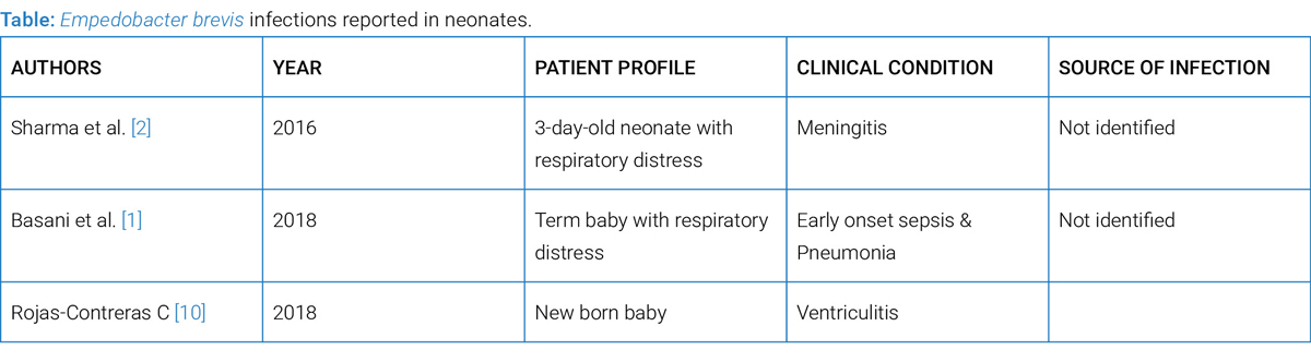 The Flavobacteriaceae family is usually yellow colony-forming bacteria which have been divided based on their genetic variation into Flavobacterium, Chryseobacterium, Myroides, and Empedobacter, with Empedobacter brevis as a distinct genetic variant [3]. E. brevis has also been found in the hospital environment, leading to many cases of nosocomial infections [6,7]. There are increasing cases of human E. brevis infections are now being reported in neonates, as showed in (Table). E. brevis, though considered rarely pathogenic, is reported to cause meningitis, pneumonia, septicaemia, and ventriculitis (Table). The bacteraemia is often associated with implanted devices, contaminated parenteral solutions, ventriculostomy drains, and vascular catheters [4,5]. E. brevis infection was reported for the first time from India in a 3-day-old neonate with sepsis and meningitis in 2016 by Sharma et al. [2].